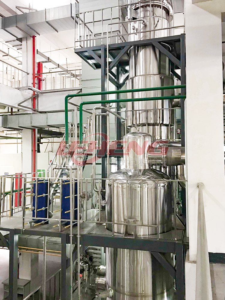 該項目是用于中藥乙醇提取液的蒸發濃縮,系統設計為MVR兩級降膜蒸發系統,降膜蒸發器擁有結構流程簡單,可連續運行,安全可靠,可蒸發濃度較高的、粘度較大(0.05-0. 45Pa*s)的物料,膜狀流動,溫差損失小等優點。